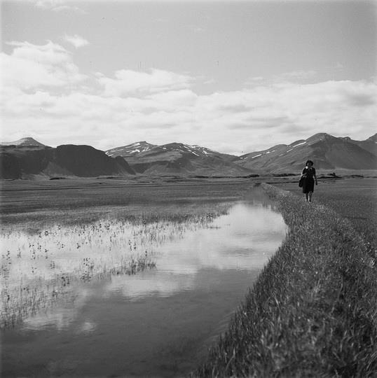 Kona, líklega Jósefína Gísladóttir gengur á flóðgarði á engjunum á Hvanneyri. Hafnarfjall í baksýn.