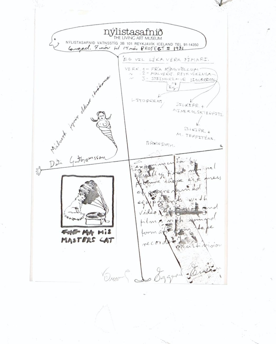 Veggspjald: vegna samsýningar 7.11.-14.11.1981 á Nýlistasafninu, sýnir sv/hv teikningu sem skiptist í fjóra hluta, líklegt að hver listamaður hafi teiknað inní einn hlut á mann ásamt kynningartexta.