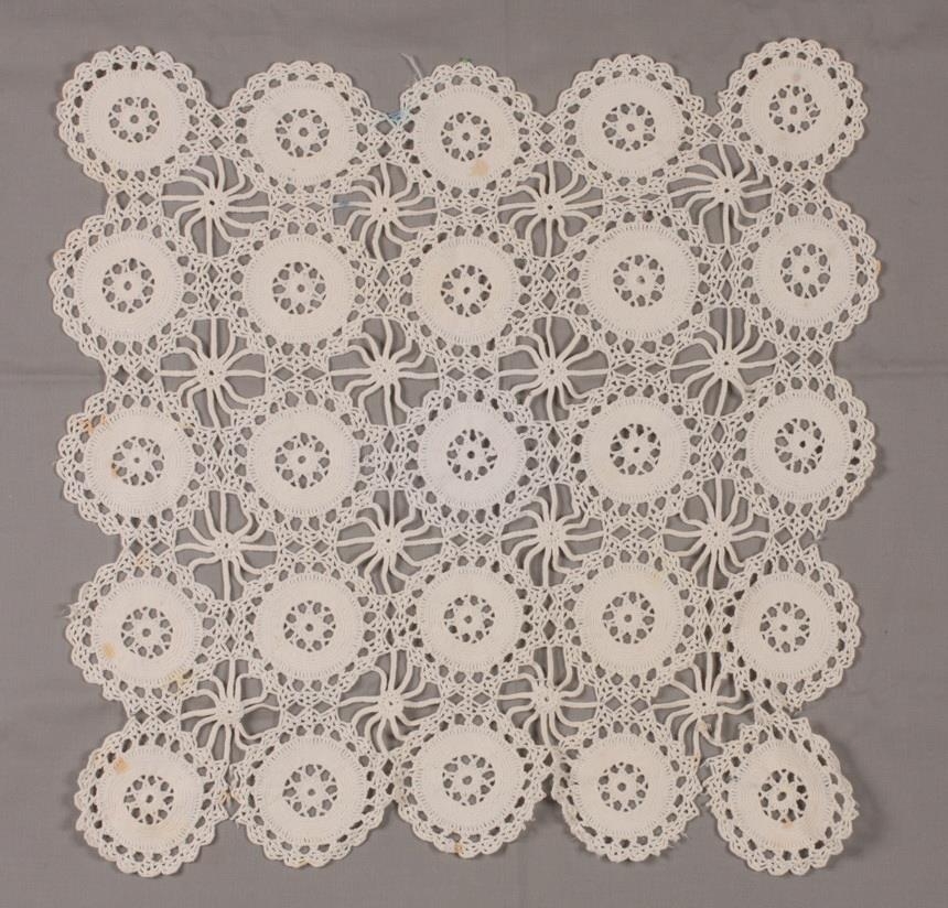 Dúkur heklaður úr fínu garni. Stærð er 52 x 52 cm. Hringir sem eru síðan heklaðir saman. Dúkurinn er dálítið blettóttur.