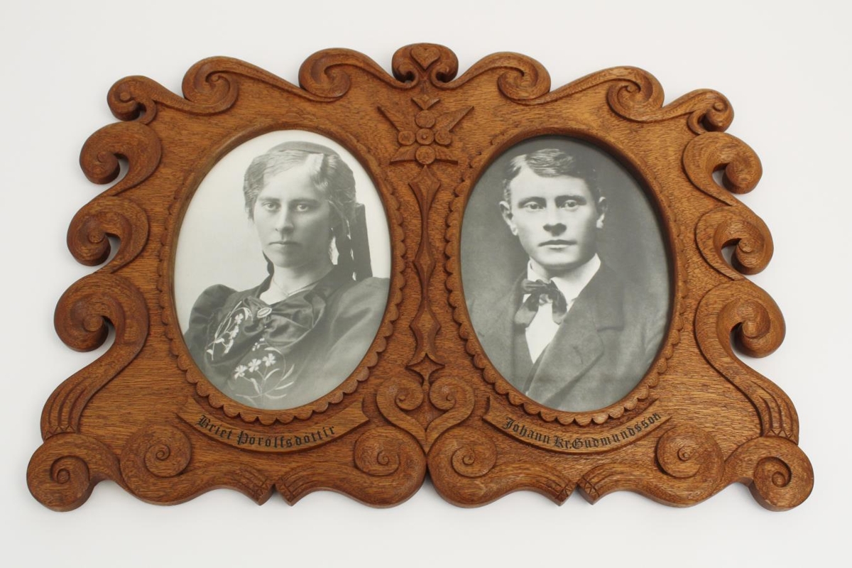 Mynd af hjónunum Jóhanni og Bríet í fallega útskornum ramma, eftir Gunnar son þeirra. Áður skráð í munaskrá nr. 1313