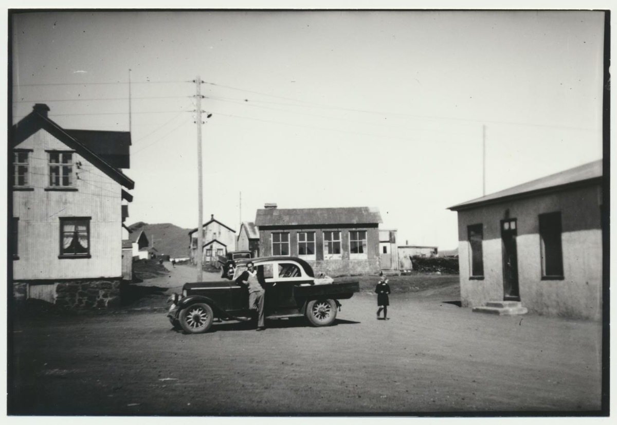 Aðalsteinn stendur við bíl, hann átti heima í Sölkutóft. Staðsetning óþekkt, ekki á Eyrarbakka.
