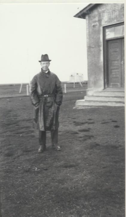 Maðurinn á myndinni er trúlega Sigurður Greipsson í Haukadal, við Barnaskólann
