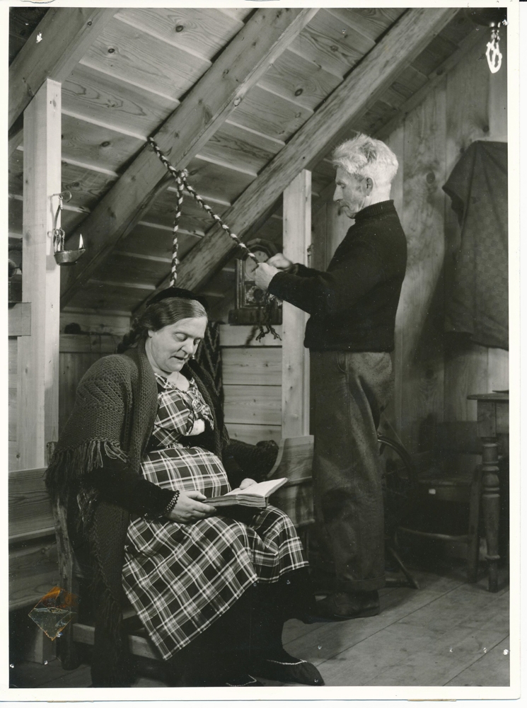 Mynd úr baðstofu, kona, Þórey Jónsdóttir á Moldnúpi, að lesa í bók og karlmaður, Tómas Þórðarson, að flétta reipi.