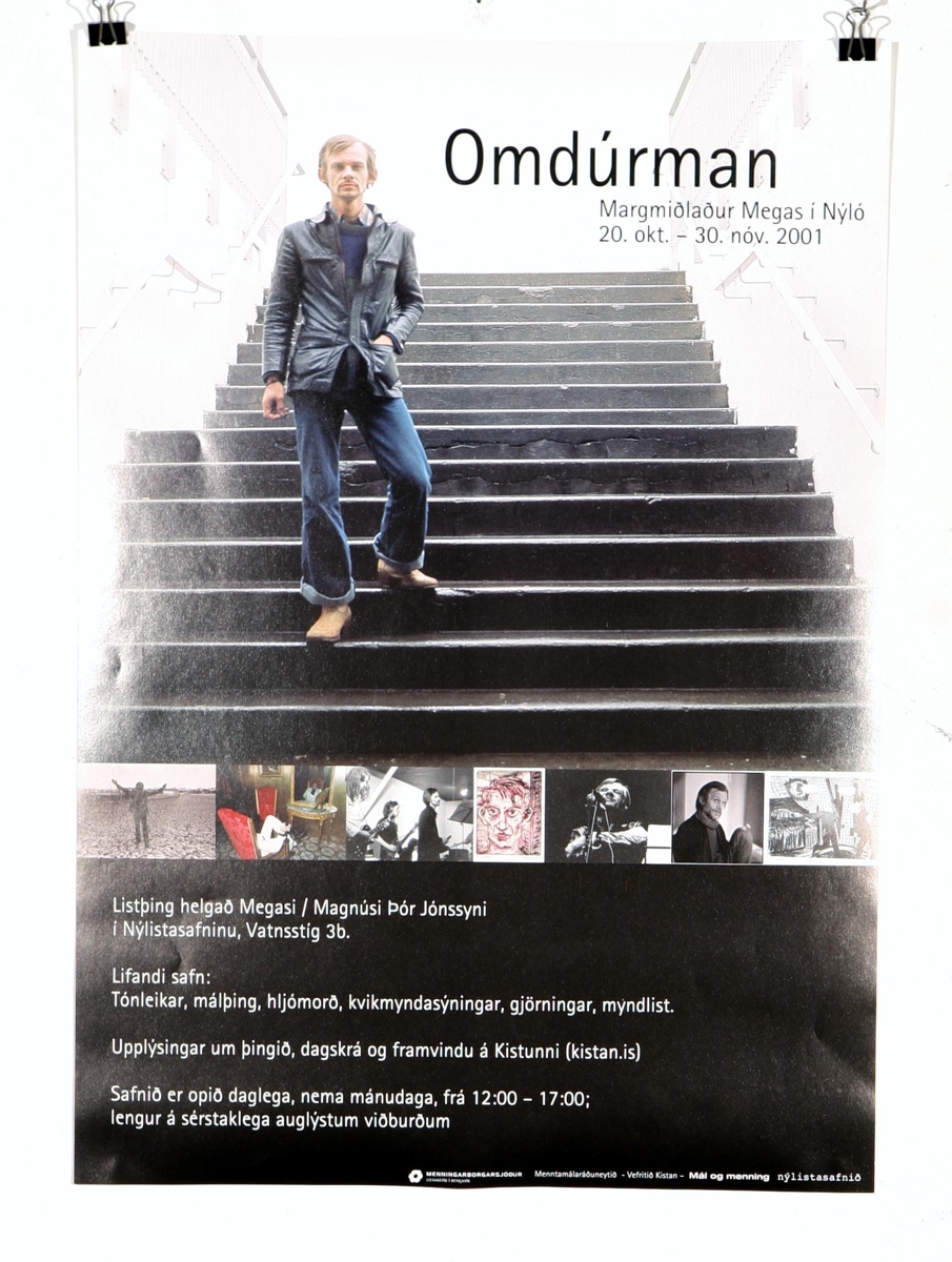 Veggspjald: vegna málþings um Megas 20.10.-30.11.2001, sýnir litaljósmynd af Megasi að labba niður stiga ásamt kynningartexta.