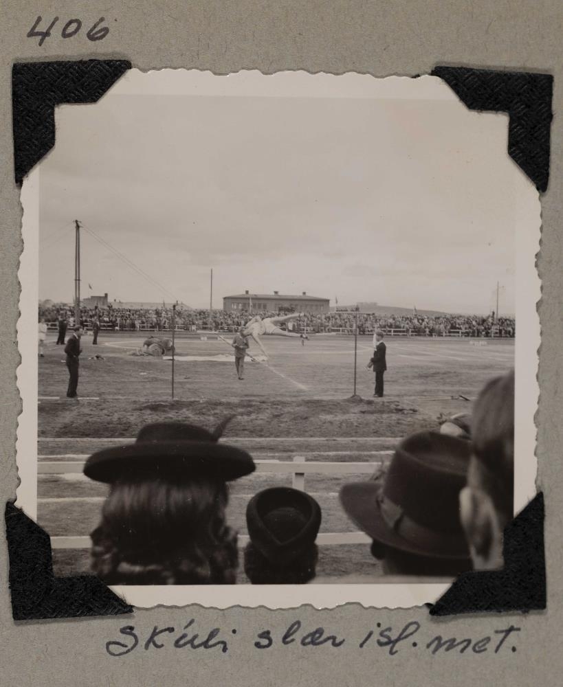 Skúli Guðmundsson að keppa í hástökki á Melavellinum, fjöldi áhorenda í baksýn. Við myndina er skrifað: 1946. Skúli slær ísl.met.