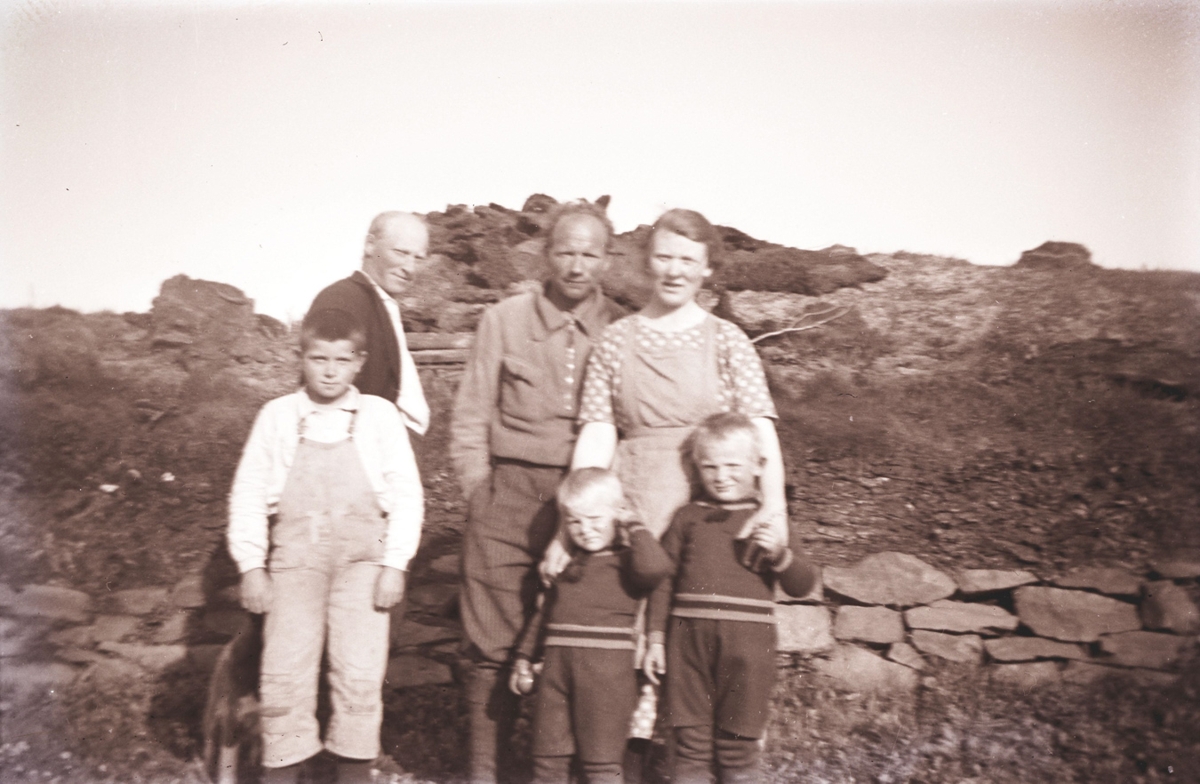 Við svonefnda Hornhúshlöðu í Árbót. Framri röð, frá vinstri : Hjörtur Arnórsson, f.1932, Hreiðar Arnórsson, f.1933 ; óþekktur strákur. Önnur röð frá vinstri : Þuríður Bjarnadóttir, f. 1899, kona Arnórs Sigmundssonar, f.1901 og Jón Bjarnason, f.1901: Jón Bjarnason endurbyggði Hornhúshlöðu í Árbót, 1936.