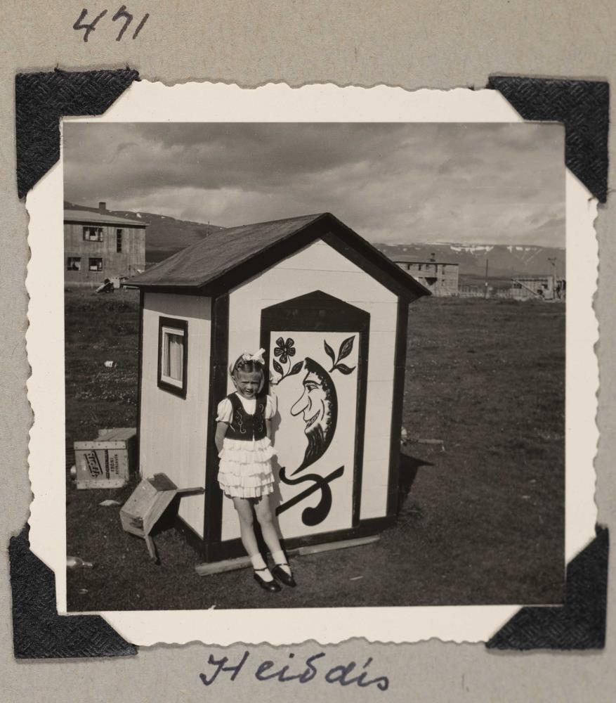 Heiðdís Norðfjörð stendur við fagurlega skreytt dúkkuhús í garðinum. Við myndina er skrifað: 1947. Heiðdís.
