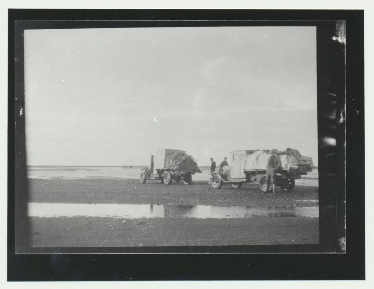 Þrír karlmenn við tvo vörubíla, með farmi á.