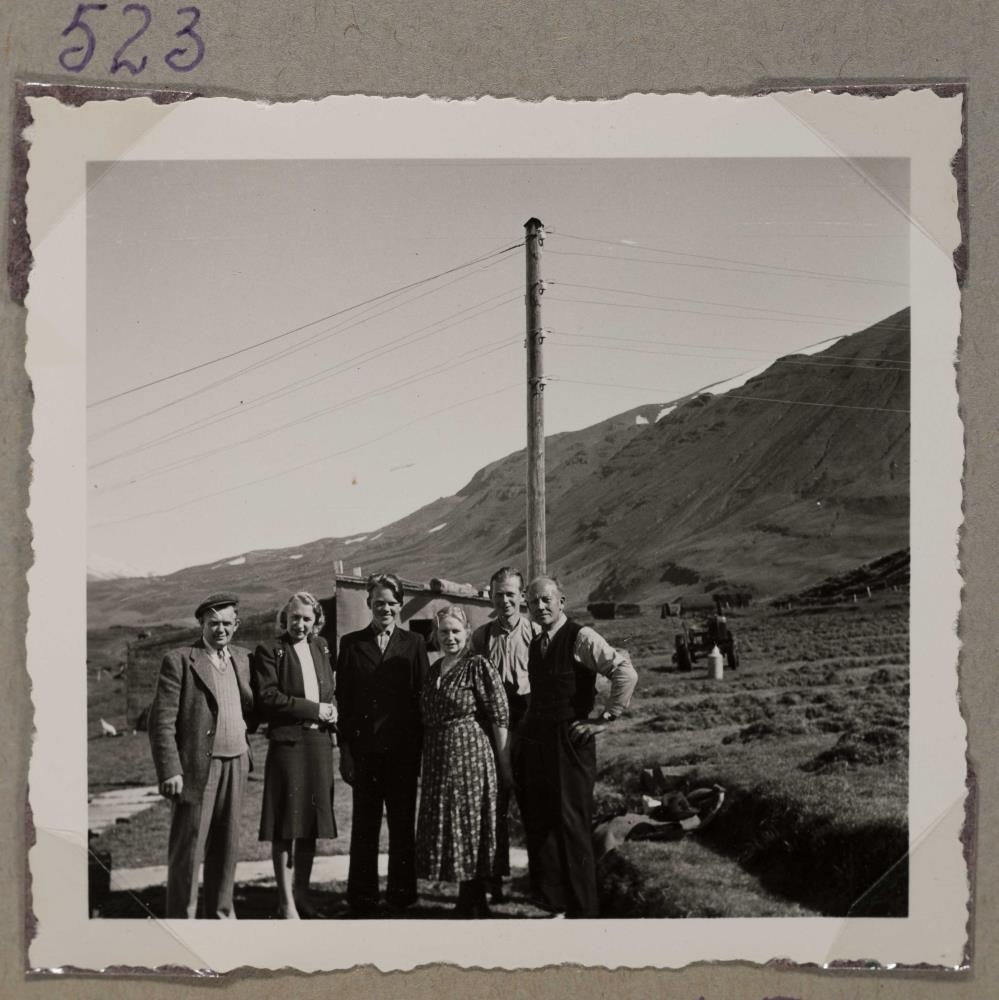Hópur fóks í forgrunni framan við lítinn skúr, Sigurður og Ásta yst t.v. Túm með múgum og Farmal Cub dráttarvél í baksýn t.h. Við myndina er skrifað: 1947. Hópmynd.