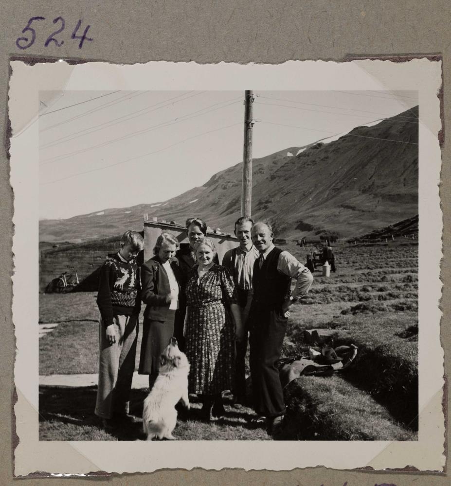 Hópur fólks framanvið lítinn skúr, hundur stendur fyrir framan. Túnsléttur með heymúgum og Farmal Cub dráttarvél í baksýn t.h. Við myndina er skrifað: 1947. Hópmynd.