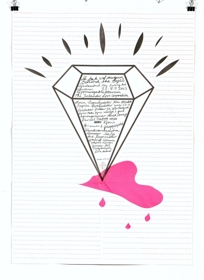 Veggspjald: vegna sýningar Gjörningarklúbbsins 9.8.-7.9.2003, prentað báðu megin á veggspjaldinu, önnur hliðin sv. með handteiknaðri mynd af þremur fígúrum ásamt sýningartexta, á hinni hliðinni sýnir línustrikað blað með handteiknuðum demanti, bleiku hjarta ásamt sýningartexta.