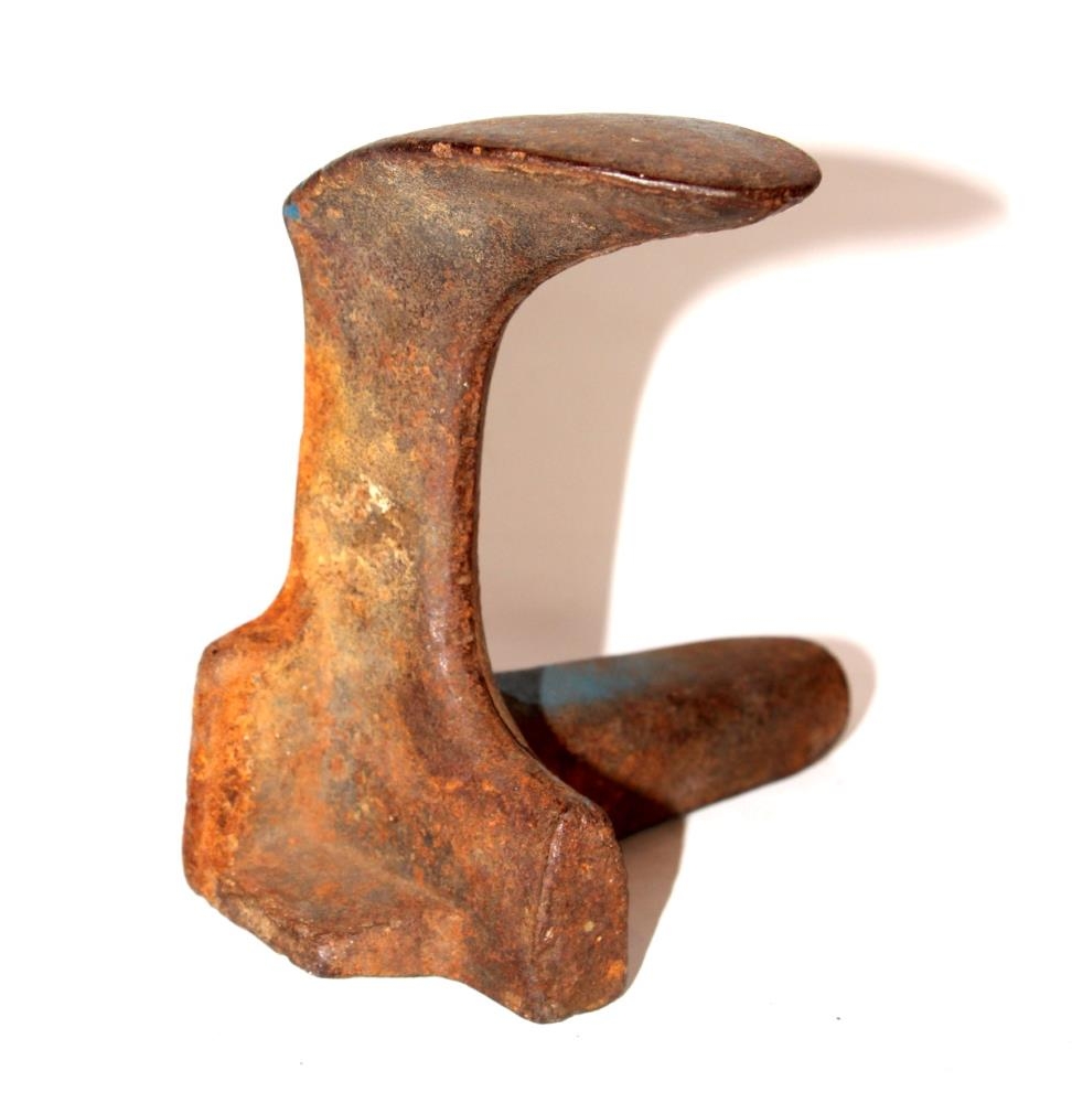 Skósmíðaleistur úr járni, blár að lit. L. 14,5 cm, h. 10 cm, br. 15 cm. Er orðið ryðgað að hluta.