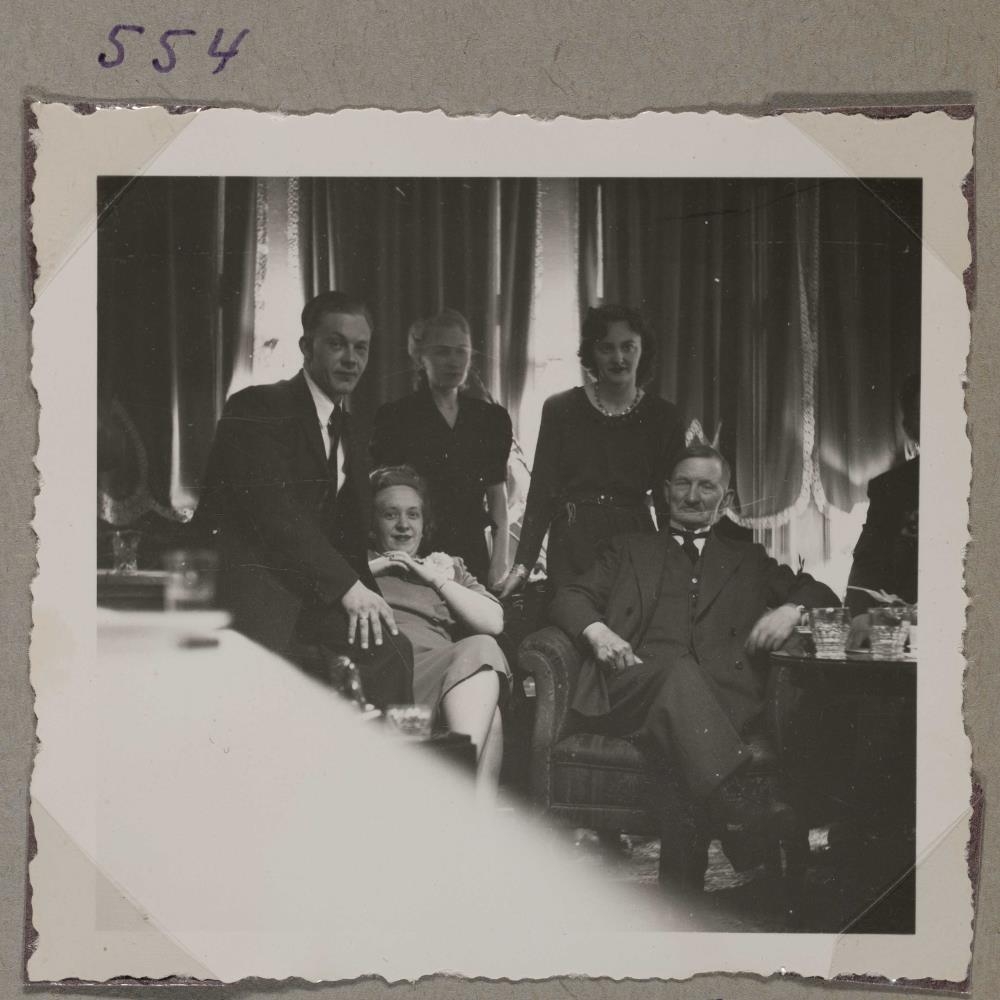 Brúðhjónin, Ásta Guðmunds og nokkrir til. Við myndina er skrifað: 1946. Brúðkaup Hönnu Skagfjörð og Hákonar Guðmundssonar 1946.