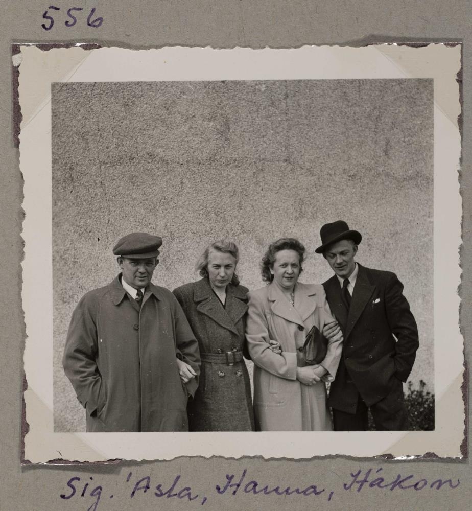 Systkinin Ásta og Hákon ásamt mökum sínum fyrir utan húsið. Við myndina er skrifað: 1946. Brúðkaup Hönnu Skagfjörð og Hákonar Guðmundssonar 1946. Sig., Ásta, Hanna, Hákon.