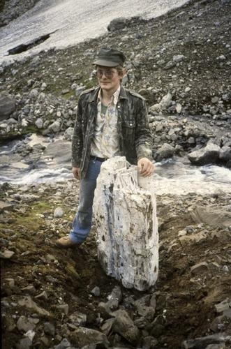 Maður stendur við steinrunninn trjástofn í Loðmundarfirði. Ljósm: Ómar Ragnarsson, sumar, 1981.