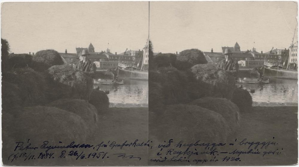 við heybagga á bryggju.