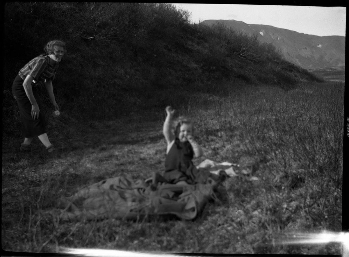 Barn situr á teppi, Kona stendur