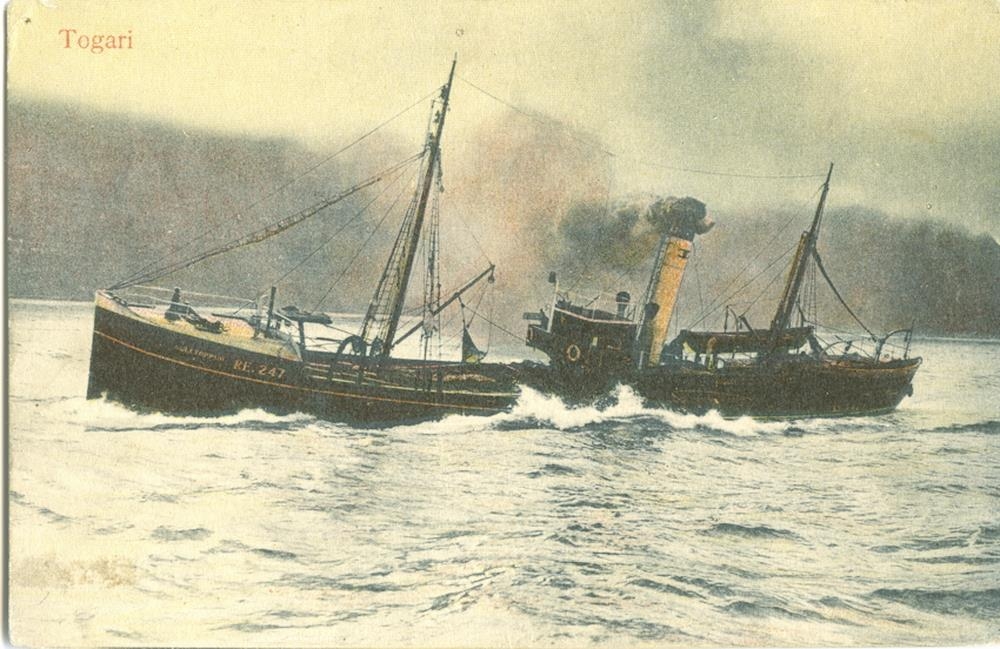 Síðutogari, gufuknúinn, á siglingu. Á kinnung er nafnið: GULLTOPPUR RE 247.