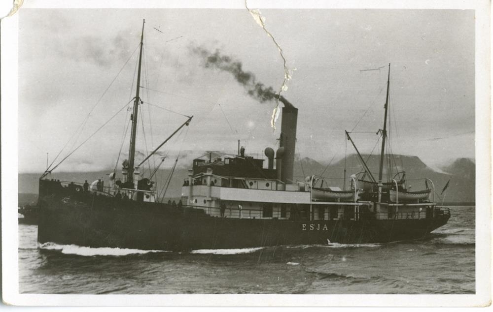 Farþega- og fraktskip, gufuknúið, á siglingu. Á hlið þess stendur. ESJA.
