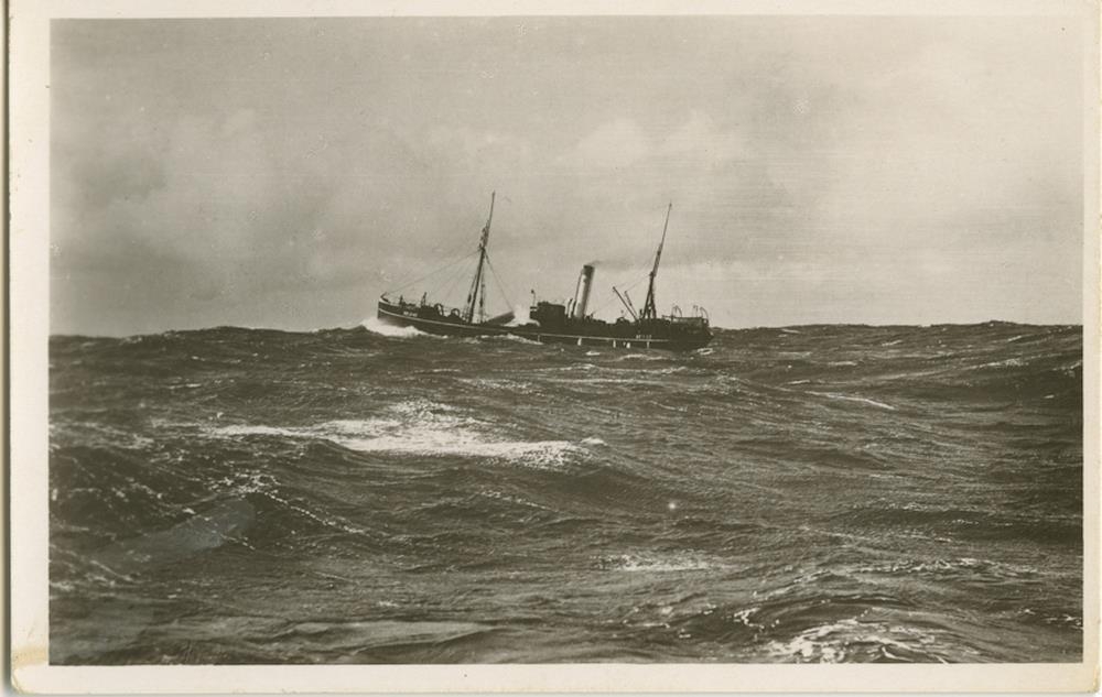 Síðutogari, gufuknúinn, á siglingu. Á kinnungnum eru stafirnir: RE 247