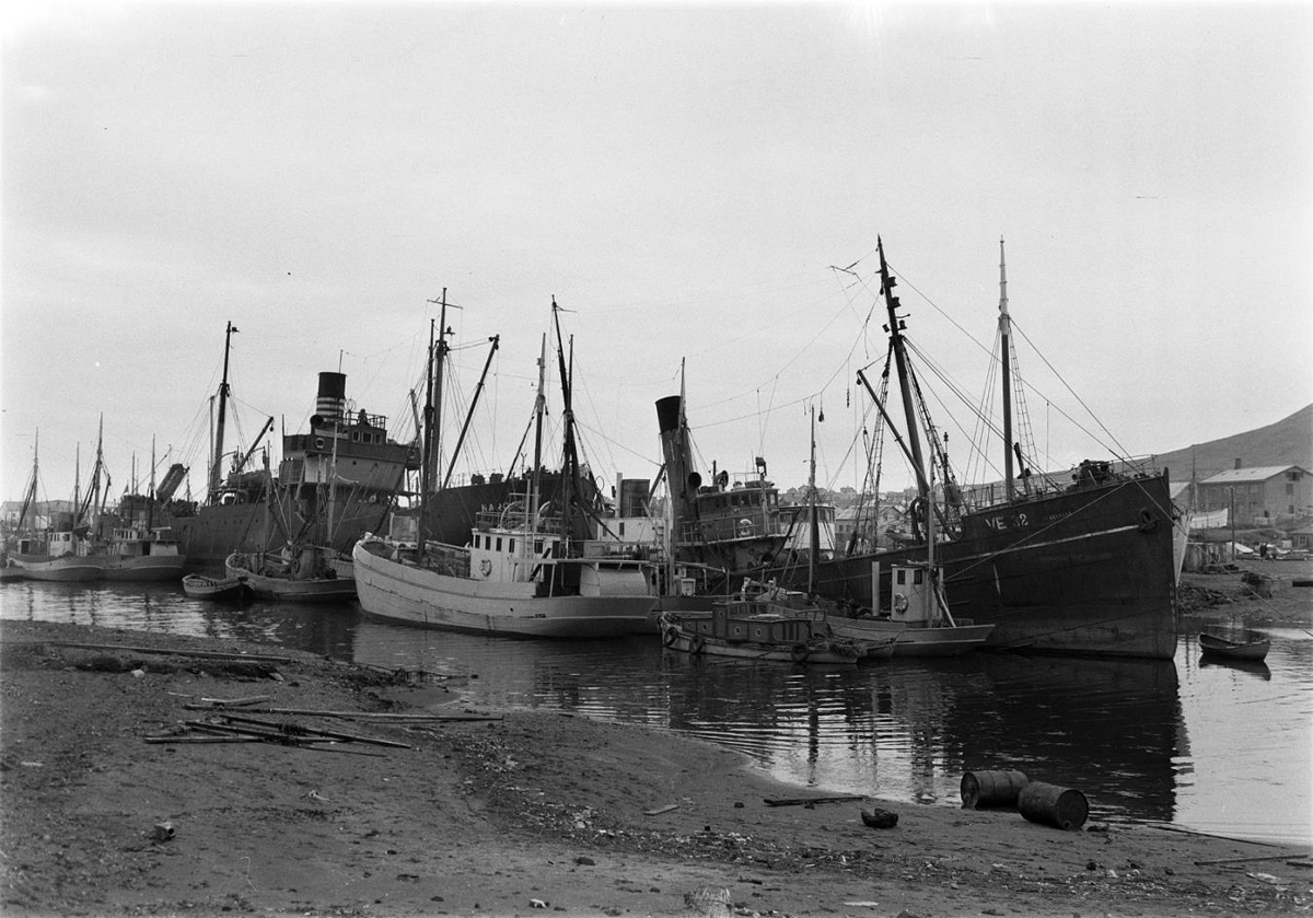 „Myndin er tekin rétt eftir stríð. Togarinn til hægri er HELGAFELL VE 32 sem keyptur var tíl eyja í árslok 1945. Flutningaskipið fyrir aftan er enn með björgunarfleka stríðsáranna þannig að þetta er ekki mikið síðar.“ (BÞ 2018)