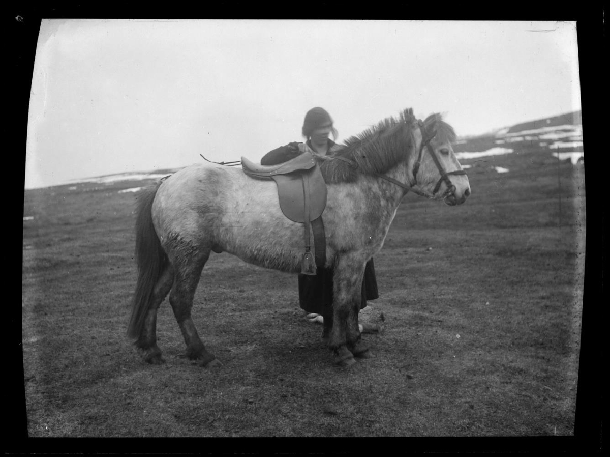 Kona stendur hjá hesti með hnakk og beisli.