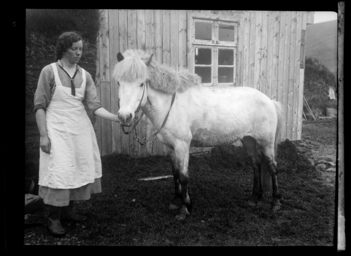 Kona með hest við torfbæ. Ólöf Magnúsdóttir