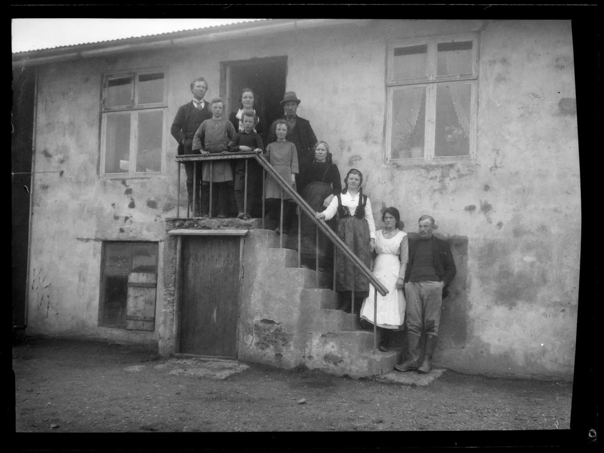 Hópur fólks á tröppum húss. Húsið er Meleyri,