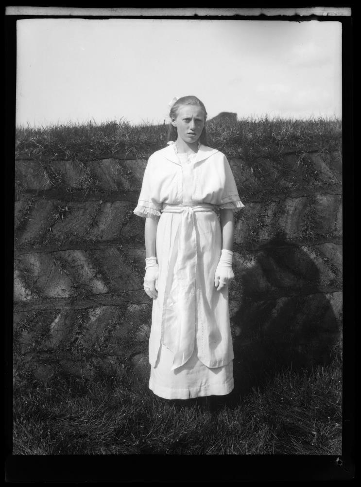 Stúlka í hvítum kjól með hvíta hanska. Ásta
