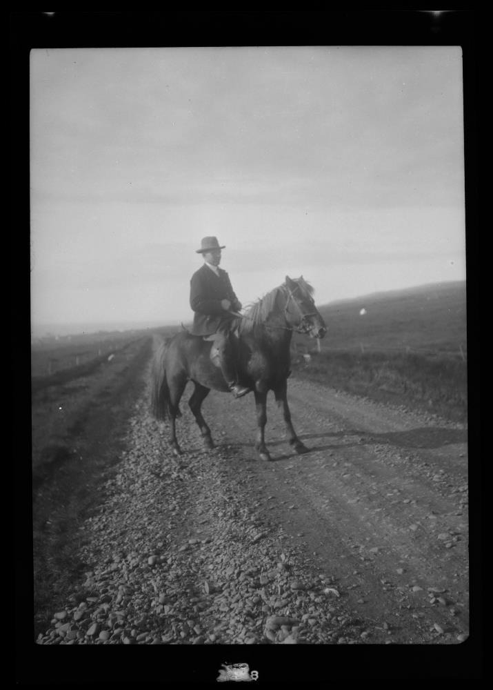 Maður á hesti á vegi. Hannes Jónsson, kaupfélagsstjóri