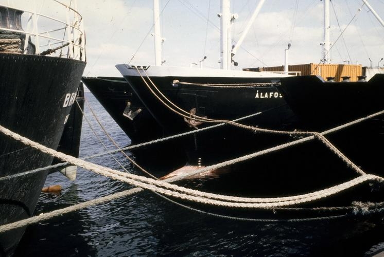 Eimskip - fossar. Nokkrir fossar Eimskips við bryggju, þ.á. m. Brúarfoss og Álafoss. Víð mynd.