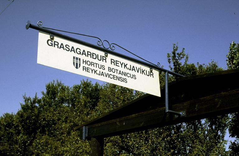 Skilti við inngang í Grasagarð