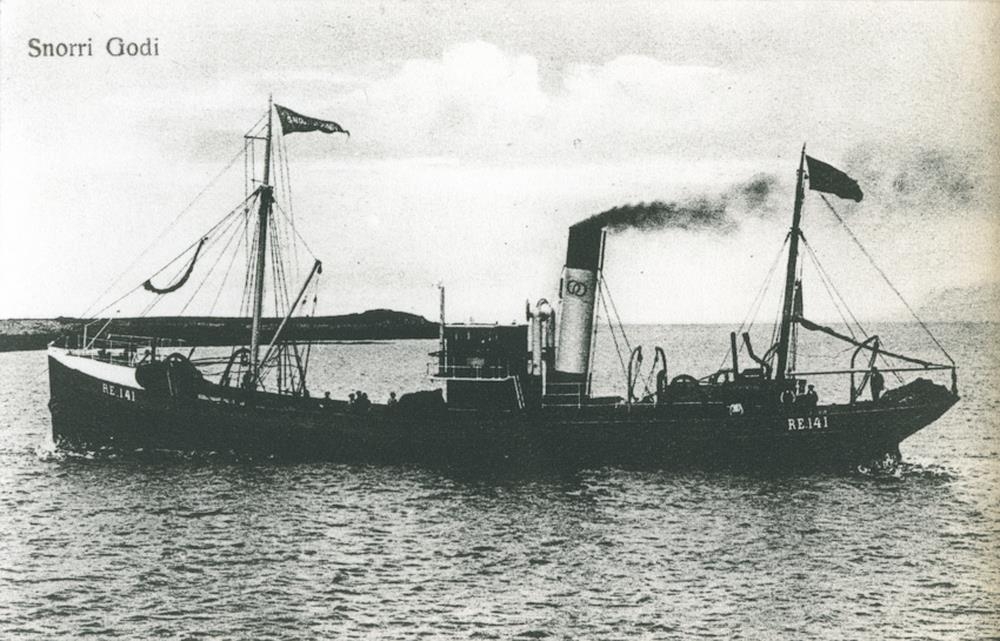 Síðutogari, gufuknúinn, á hægri siglingu. Á kinnungnum eru stafirnir: RE 141. Land í baksýn, Viðey. Efst t.v. er prentað: Snorri Goði.