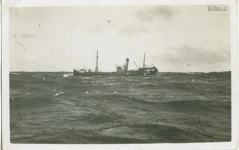 Síðutogari, gufuknúinn, á siglingu. Á kinnungnum er nafnið: HILMIR RE 240.