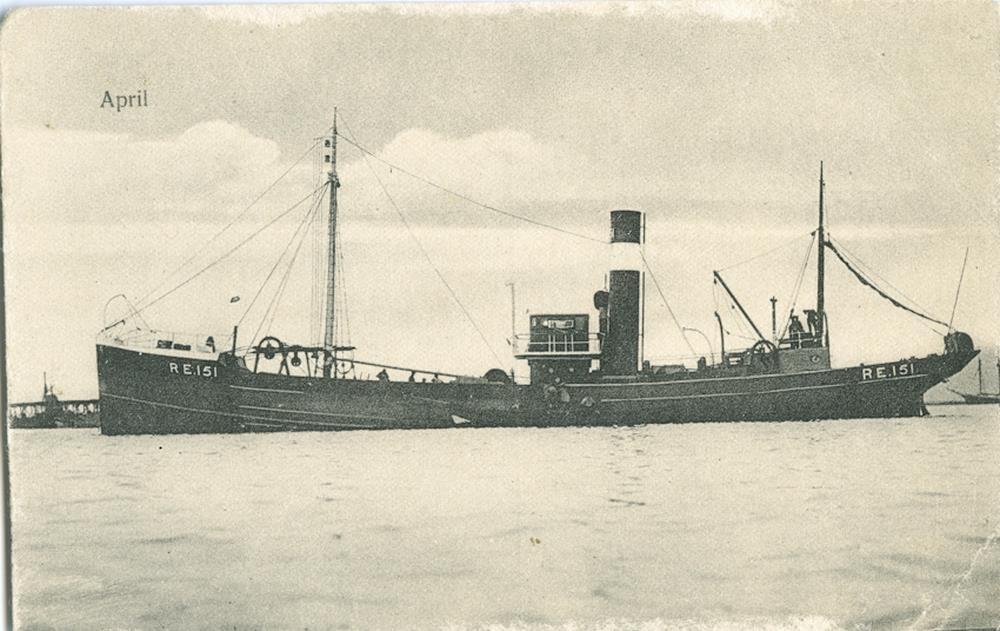 Síðutogari, gufuknúinn, á hægri siglingu innan hafnar. Á kinnungnum eru stafirnir: RE 151. Efst t.v. er prentað: Apríl. Í baksýn eru mannvirki við hafnargerð.