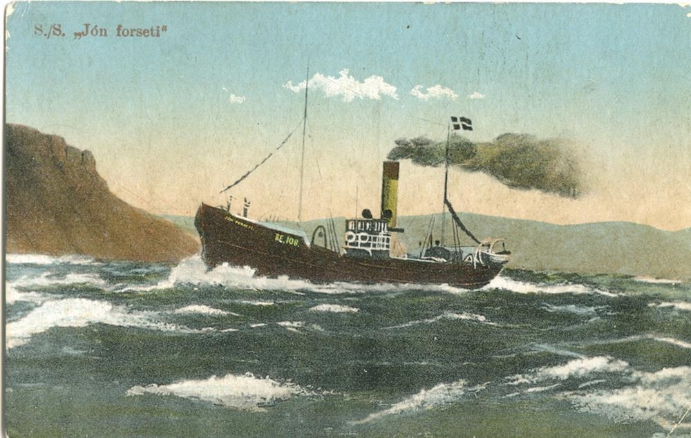 Ljósmynd af málverki, handlituð. Síðutogari, gufuknúinn, á siglingu í strekkingsvindi, Á kinnungnum er nafnið: JÓN FORSETI RE.108. Land í baksýn. Efst t.v. er prentað: S./S. „Jón forseti“.