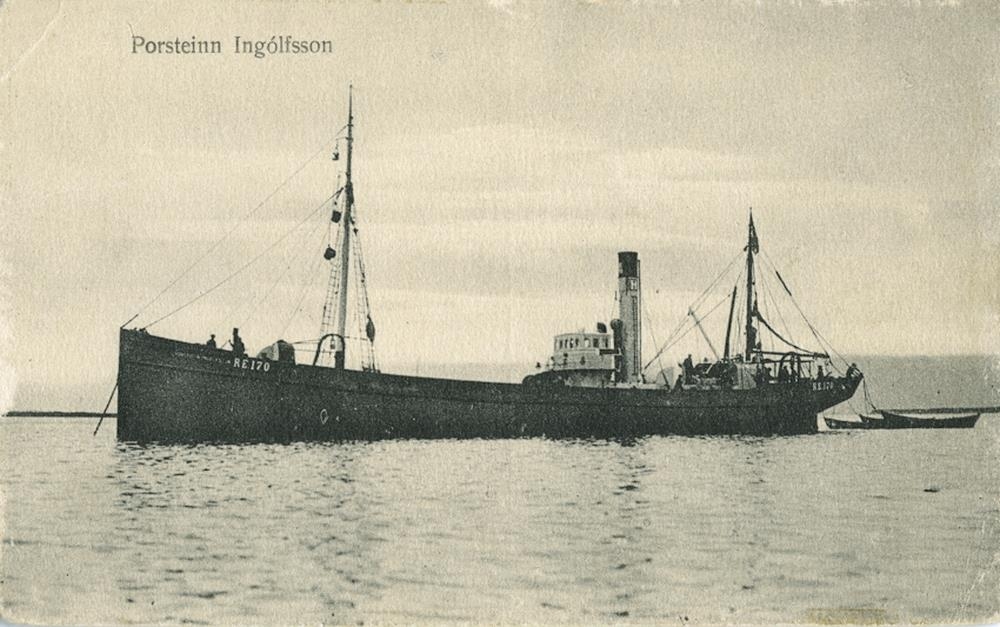 Síðutogari, gufuknúinn, liggur við akkeri. Á kinnungnum er nafnið: ÞORSTEINN INGÓLFSSON RE 170. Þrír árabátar eru bundnir við skut togarans. Efst t.v .er prentað: Þorsteinn Ingólfsson.
