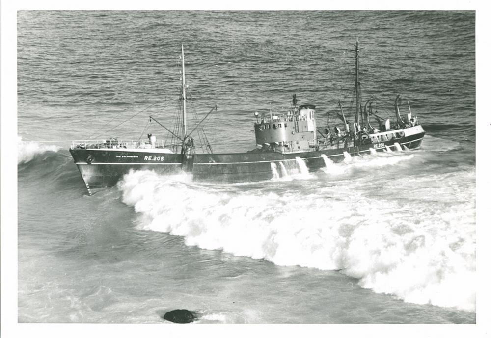 Síðutogari, gufuknúinn, liggur á strandstað í allnokkru brimi. Á kinnungnum er nafnið: JÓN BALDVINSSON RE 208.