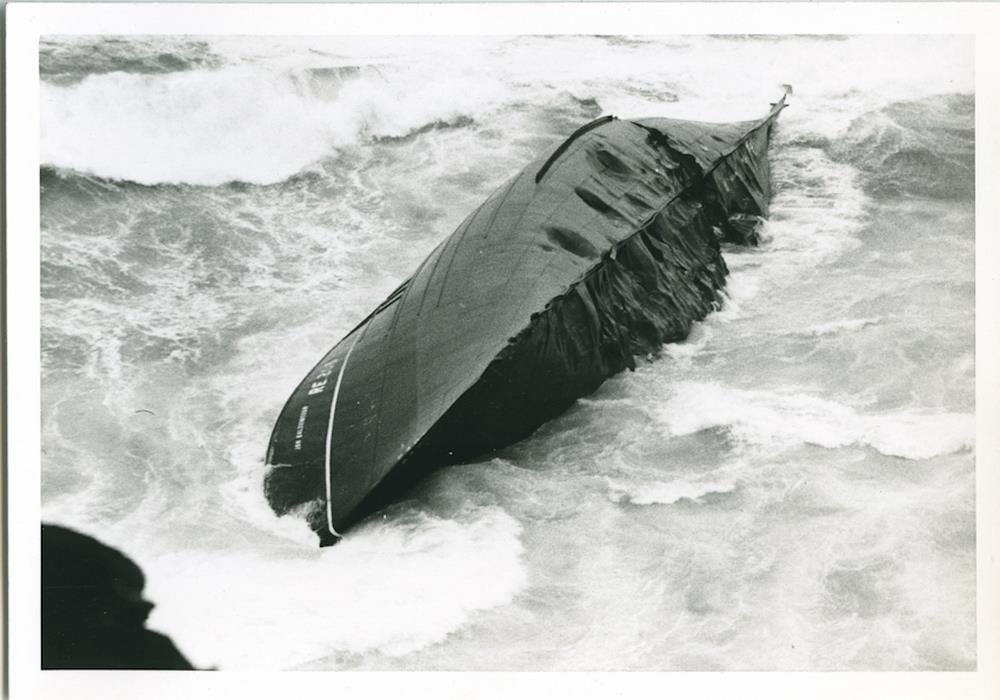 Síðutogari, gufuknúinn, liggur á strandstað og snýr kjölurinn næstum beint upp, dældaður mjög og rifinn. Á kinnungnum er nafnið: JÓN BALDVINSSON RE 208.