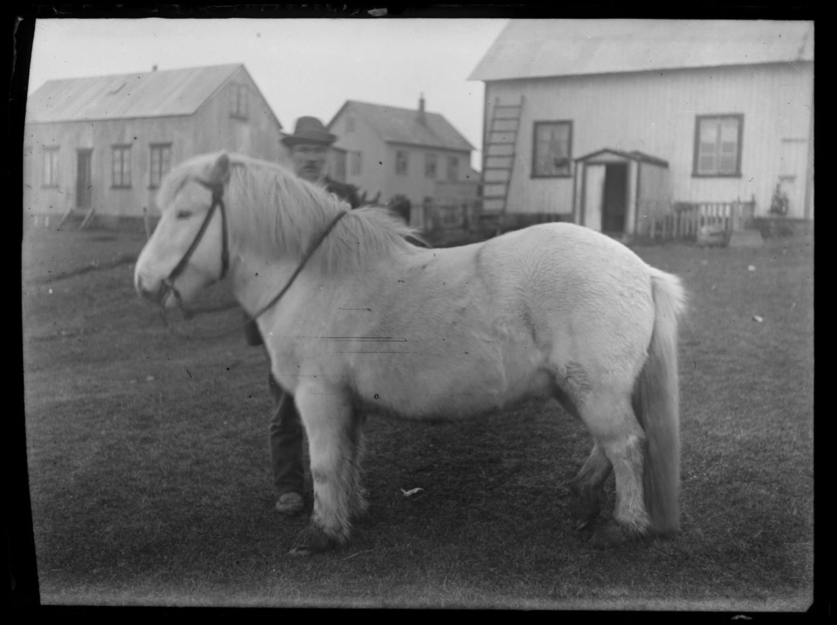 Hvammstangi. Maður með hest. Hús í baksýn.