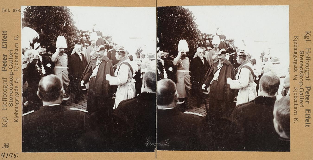 sýnir, sennilega konung, ganga á milli tveggja raða einkennisbúinna embættismanna