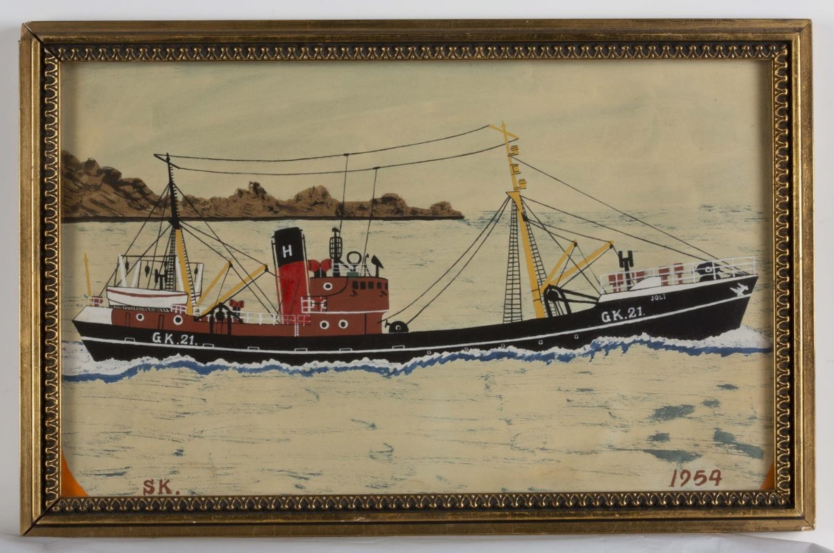 Vatnslitamynd af togaranum Júlí GK 21. Máluð 1954 af S.K; óvíst hver hann var. Myndin er í gylltum, útskornum tréramma en frekar laus í honum. Guðlaugur nokkur Adólfsson fórst með togaranum á sínum tíma en hann var skyldur eiginmanni gefandans. Guðlaugur var sonur Kristínar Samúelsdóttur.