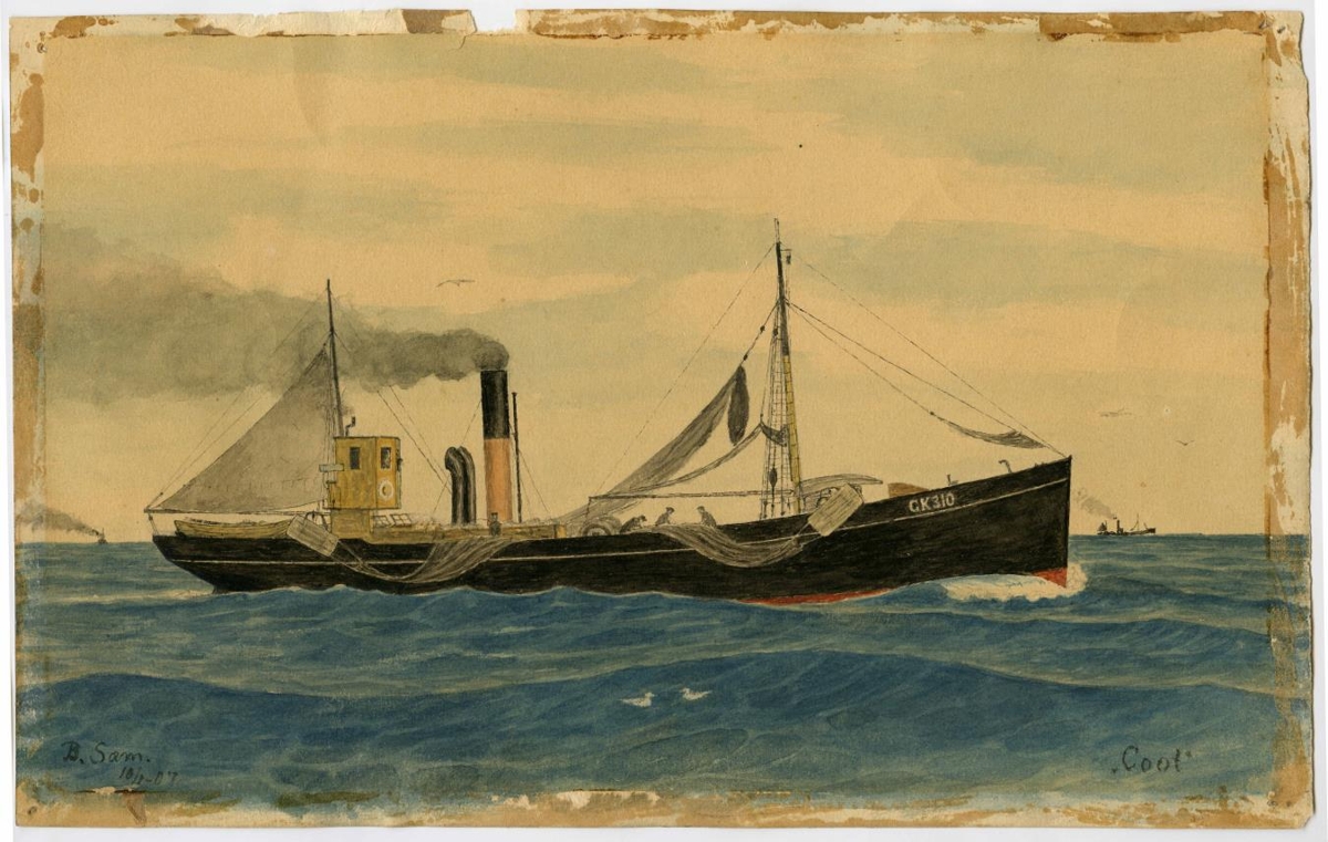 Vatnslitamynd af togaranum Coot GK 310. Göt eftir pinna eru í öllum hornum myndarinnar eftir að hún var tekin úr rammanum og fest upp á sýningu. Þá hefur einnig rifnað lítilsháttar af efra kanti myndarinnar. Ramminn er ófundinn. Myndin barst Sjóminjasafninu á árinu 1986 en gefandi er ókunnur.