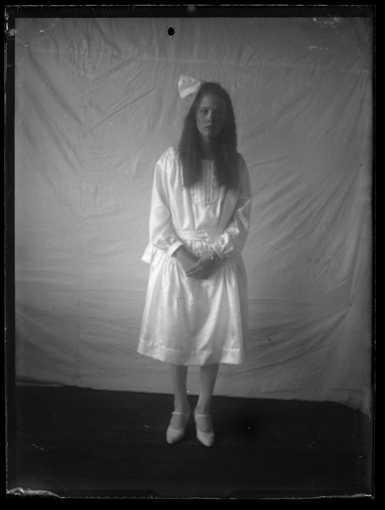 Stúlka í hvítum kjól. Fermingarmynd. Ásta
