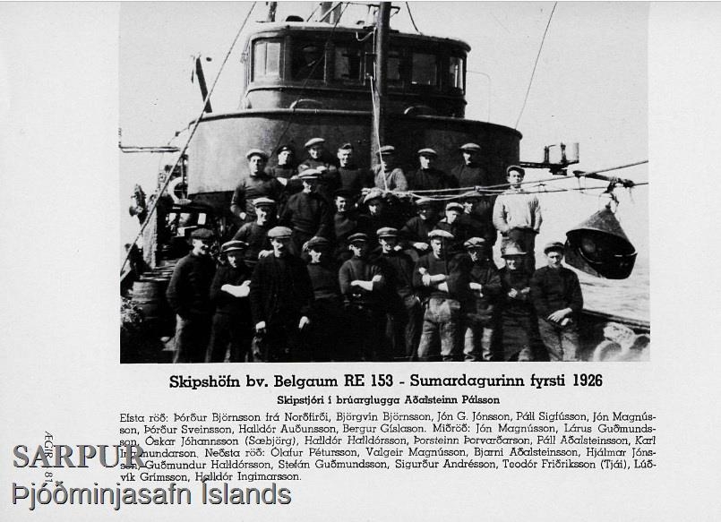 „Þessa mynd birti Ásgeir heitinn Jakobsson í tímaritinu ÆGI , 2.tölublað 1986. Þar eru allir á myndinni nafngreindir.Tekin um borð í BELGAUM RE 153 á sumardaginn fyrsta 1926, segir þar í myndatexta, og hefur Ásgeir ábyggilega haft örugga heimild fyrir því.“ (BÞ 2022)
