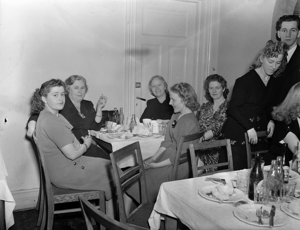 Ljósmyndarafélag Íslands, gestir við borð í samkvæmi. Gróa, Steinunn Thorsteinsson, Sigr. Zoëga og tvær aðrar starfst. ljósmst. Sigr. Zoëga og Guðm. L. Hannesson