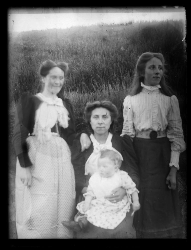 við torfvegg. F.v. Rósbjörg Þ. Blöndal, Elín P. Blöndal, Ingibjörg P. Blöndal.