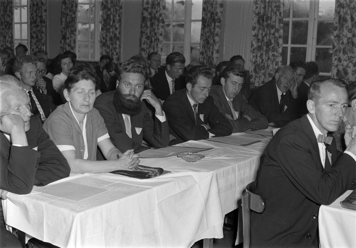 Við hægri jaðar myndarinnar er Einar Bragi með slaufu. Við borðið fyrir aftan hann má þekkja þessa: Önnur frá hægri, Petra Pétursdóttir á Skarði í Lundarreykjadal og næst henni með alskegg Sveinbjörn Beinteinsson á Draghálsi. (Kjartan Ól. 2019)
