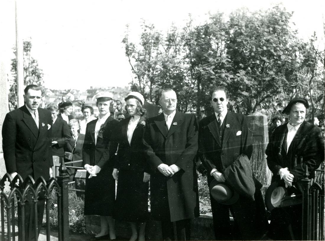 Sex manneskjur standa í röð í Suðurgötukirkjugarði á 17. júní 1953. Frá vinstri: Þór Sandholt, tvær nýstúdínur, Hallgrímur Benediktsson, Gunnar Thoroddsen og Áslaug Zoëga. Myndin er í grænu myndaalbúmi sem merkt er 17. júní og skátamyndir.
