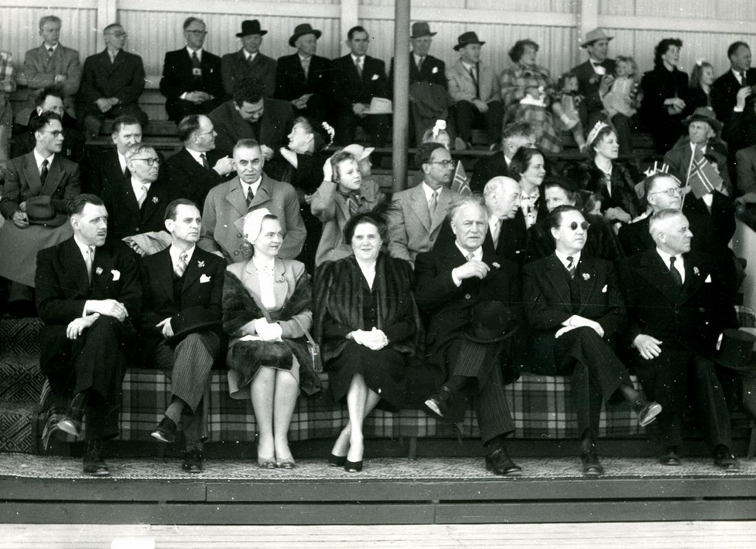 Hátíðarhöld á Melavelli 17. júní 1953. Fólk situr í stúku á Melavelli. Frá vinstri í fremstu röð eru: Þór Sandholt, tvo óþekkt, Dóra Þórhallsdóttir, Ásgeir Ásgeirsson, Gunnar Thoroddsen og sr. Bjarni Jónsson. Fyrir ofan Bjarna og Gunnar sitja Hallgrímur Benediktsson og Áslaug Zoëga. Myndin er í grænu myndaalbúmi sem merkt er 17. júní og skátamyndir.